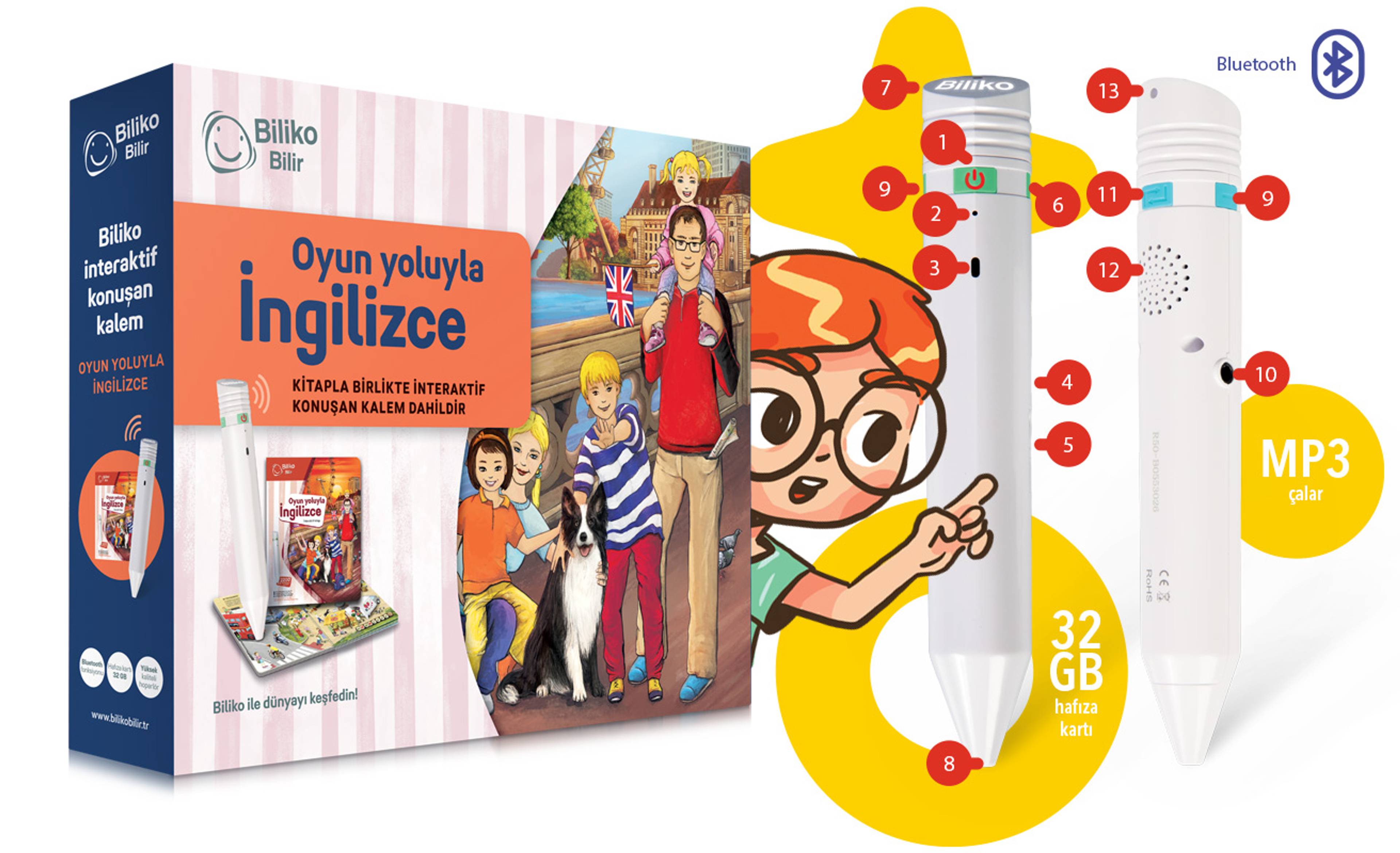 Biliko Elektronik Kalem, interaktif konuşan kitaplarımız ve oyunlarımız için vazgeçilmez bir kılavuzdur. Biliko Kalem sayesinde kitaplar konuşur, müzik çalar, şarkı söyler, öğretir ve hatta sizinle bilgi yarışmaları bile oynayabilir.